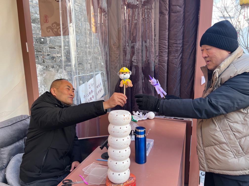 捏面人师傅王井洋(左)与顾客。新华社记者 马姝瑞 摄
