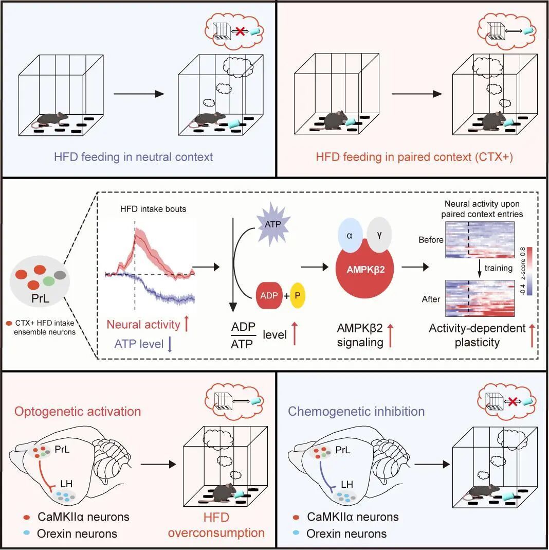 许多人一生最难忘的味道,往往来自母亲或长辈亲手做的一道家常菜。随着时间流逝,这些味道早已不再只是舌尖的体验,而是与特定的场景和情绪牢牢绑定,使食物被赋予了独特的情感色彩,甚至在多年之后,仍能轻易影响我们的摄食偏好和食欲。1月6日,复旦大学脑科学研究院/脑功能与脑疾病全国重点实验室许智祥课题组在Cell Discovery发表题为“Prefrontal cortex-to-hypothalamic outputs orchestrate cue-potentiated palatable food consumption via AMPKβ2 signaling(前额叶皮层—下丘脑环路通过 AMPKβ2 信号介导线索驱动的可口食物摄取)”的研究论文,从细胞、分子以及神经环路层面系统解析,当环境线索与可口食物形成关联并在前额叶皮层诱发神经元活动的可塑性变化后,这种大脑中的记忆痕迹如何在此后驱动进食行为。