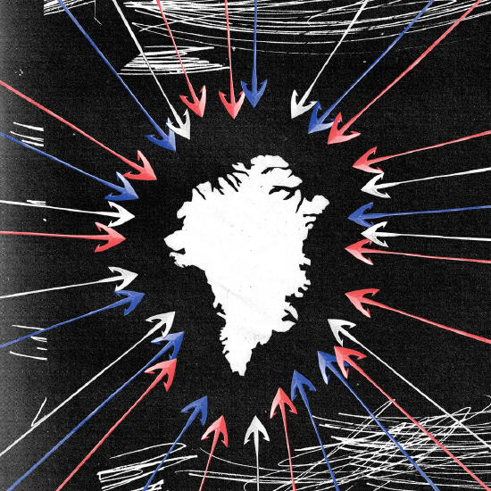 配图为格陵兰岛轮廓示意图,数支红白蓝三色箭头直指岛屿。