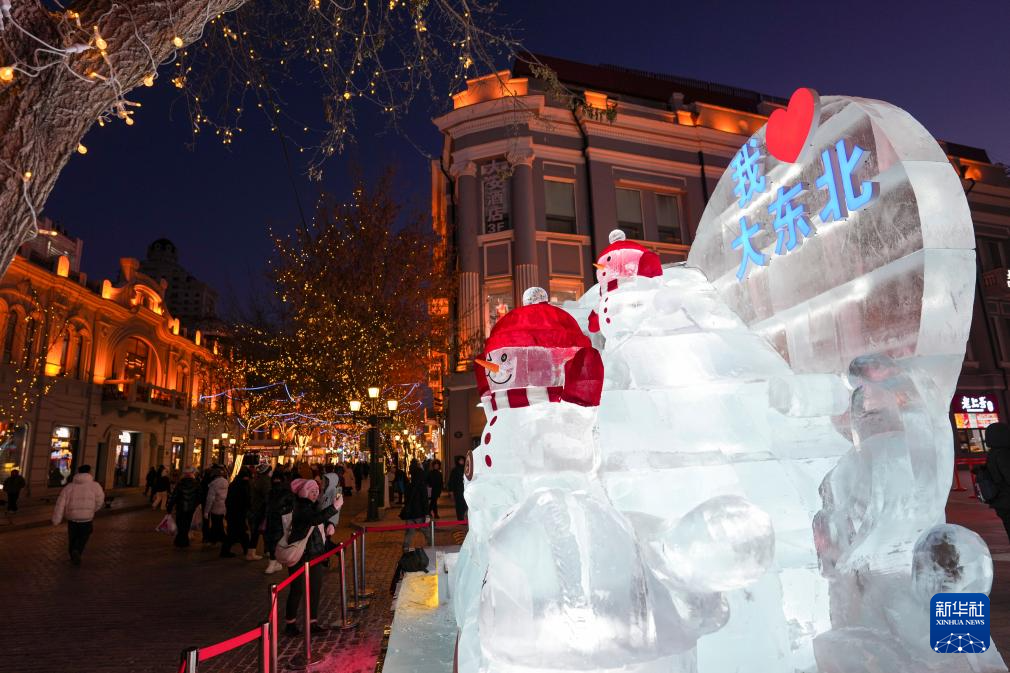 入冬以来,哈尔滨的百年老街中央大街增添了数十个冰雕景观,把中央大街装饰得流光溢彩,吸引众多市民和游客游览参观。
