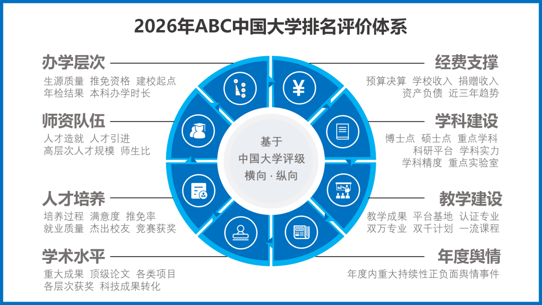师资队伍、学科建设、人才培养、教学建设、学术水平以及年度舆情,数据来源于学校信息公开、教学质量报告、职能部门官网及权威媒体报道,本年度增设满意度、双千计划、资产负债(体现可持续性)等指标。