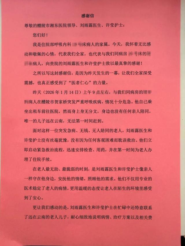 1月14日,湖南师范大学附属湘东医院呼吸内科病房内,一场紧急救治,为一位孤身就医的老人打开了生命通道,也深深打动了同在病房的王爷爷(化名)。作为邻床家属,他亲眼目睹全程后,写下一封感谢信,表达了对呼吸内科医护人员的真挚感谢。