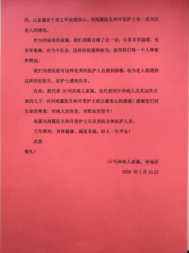 这一幕幕,在王爷爷心中激起涟漪。他在信中写道:“在当今社会,这样无私的医德与担当,值得我们每一个人尊敬。我们为医院拥有这样优秀的医护人员感到骄傲,也为罗爷爷能遇到这样的医护团队感到庆幸。”