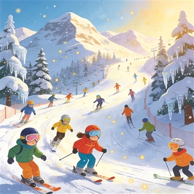 简短的开幕式结束后,我们坐上神奇的魔毯,它像自动电梯一样把我们送到雪坡的顶部。在练习区里,教练耐心地讲解临时转弯和刹车技巧,全班同学学得又快又好。教练笑着提议“滑长龙”,我因动作熟练站在队伍最前面。一开始我稳稳地下滑,后来逐渐加快速度,风在耳边呼啸,飞驰的感觉太奇妙了!听到教练喊“刹车”,我们都整齐停下。再滑一次时,我不小心摔了个屁股墩儿,但我立刻爬起来拍掉身上的雪继续前进,一点也不觉得疼!