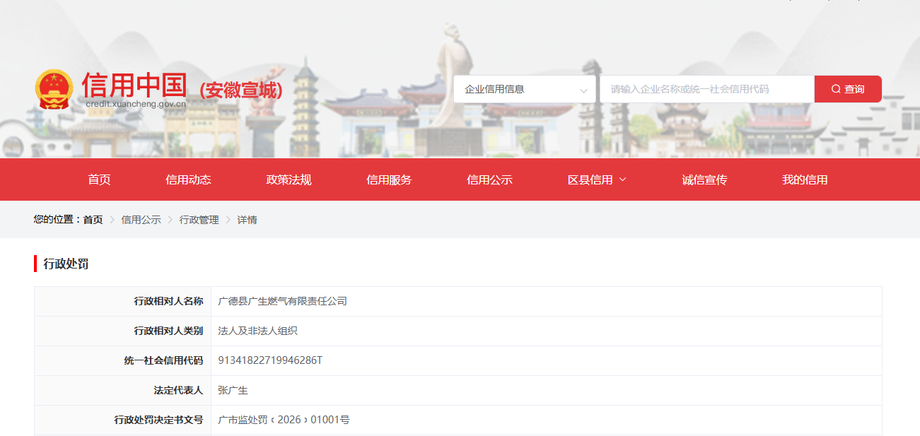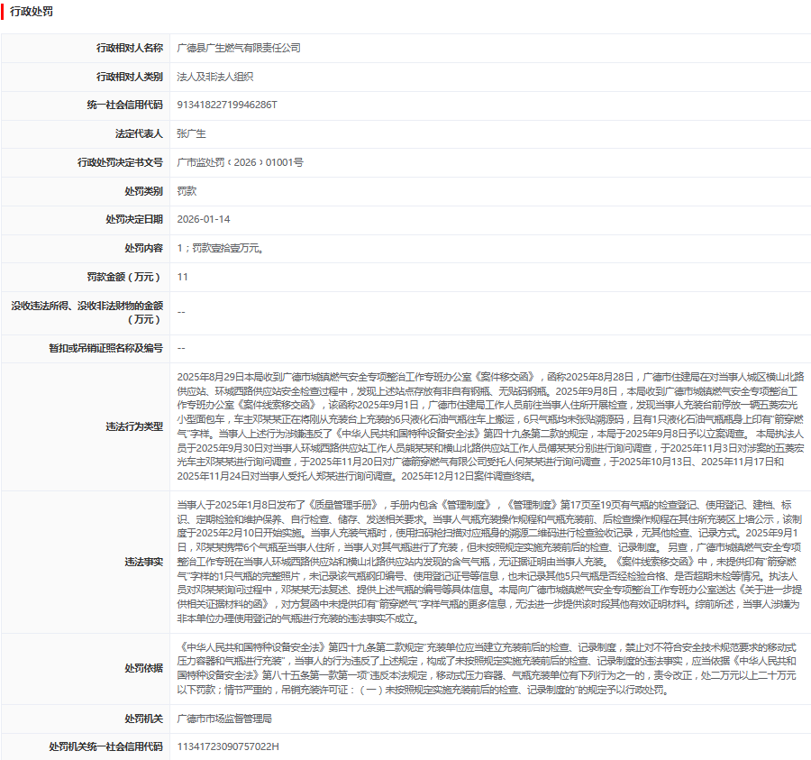 近日,据“信用宣城”公开披露行政处罚信息,因未按照规定实施充装前后的检查、记录制度,广德县广生燃气有限责任公司被处以罚款11万元。行政处罚决定书文号是广市监处罚﹝2026﹞01001号。