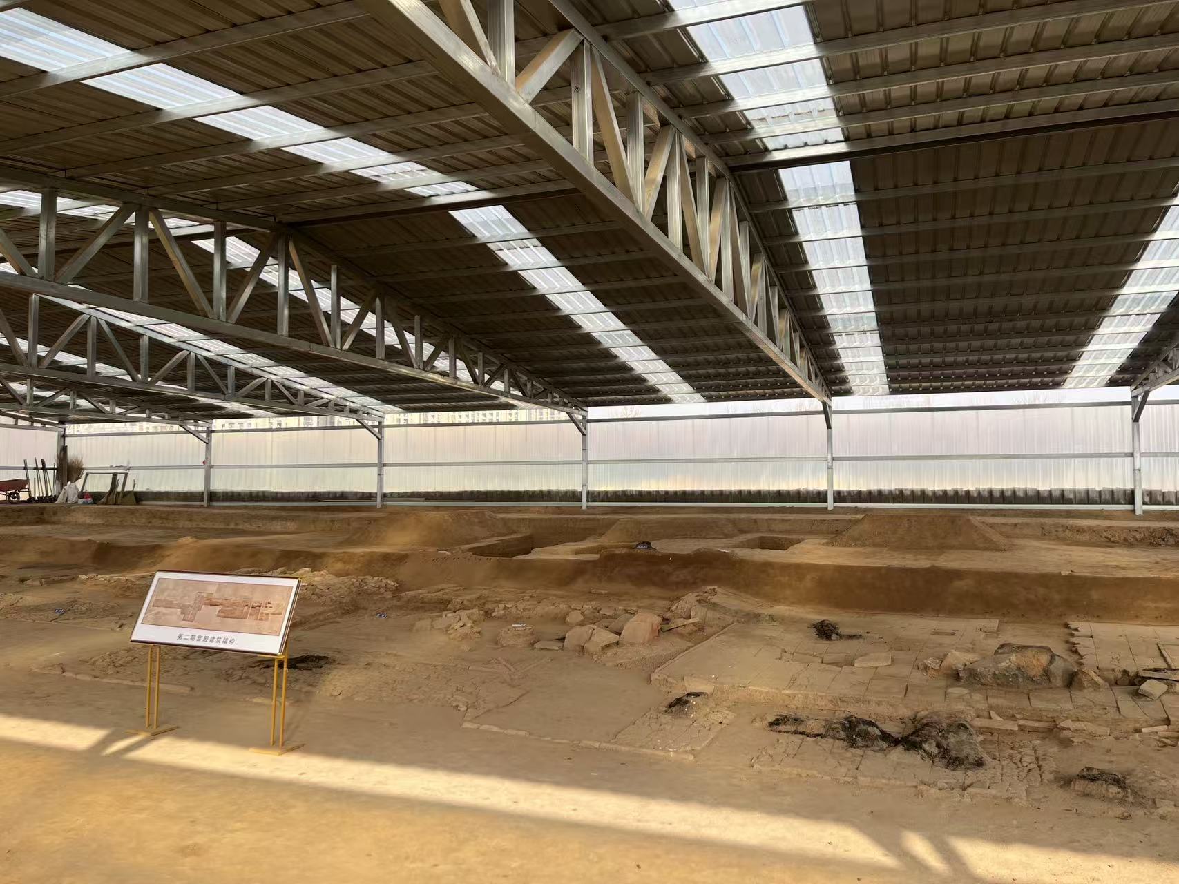 刚迈进发掘区,眼前的景象就让大家屏住了呼吸:层层叠叠的地层剖面如一部打开的巨书,每页都写满岁月的密码;云纹瓦当与菱纹地砖规整地铺开;宫殿基址旁的空心砖上雕刻着祥瑞图案;甚至还有坍塌的宫殿木梁,残存着黑色的火烧痕迹。