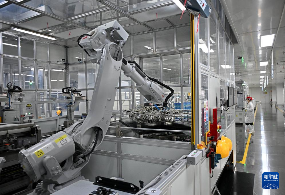 工业机器人在海信视像青岛工厂智能装配线上忙碌(1月13日摄)。