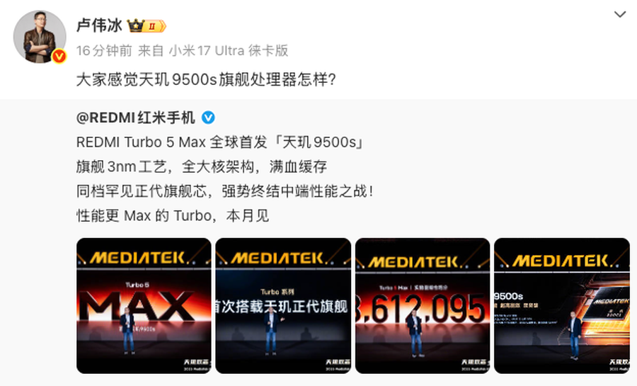 本次发布会的另一重磅新品 REDMI Turbo 5 Max,堪称中端市场的 “性能屠夫”。该机全球首发联发科天玑 9500s 旗舰芯片,这颗 3nm 制程芯片采用全大核架构,由 1 颗 3.73GHz Cortex-X925 超大核、3 颗 3.30GHz Cortex-X4 大核与 4 颗 2.40GHz Cortex-A720 大核组成,搭配 29MB 超大缓存与 Immortalis-G925 GPU,综合安兔兔跑分突破 361 万,性能直逼骁龙 8 Gen5 等旗舰芯片。
