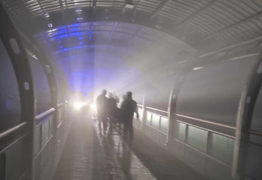 面对能见度极低、视线完全受阻的恶劣通航环境,经验丰富的执法人员沉着应对,一方面与指挥中心密切配合严格管制江面船舶,另一方面利用雷达、电子海图和AIS等导助航设备和派人船头瞭望等多种手段,在迷雾中开辟出一条安全的“生命通道”,顺利抵达长横渡横沙侧码头,成功接到重伤人员。随后,载着伤员的海巡艇破雾前行,6时00分将伤员平安送达长横渡长兴侧码头,等候在此的救护车立即接力送医。