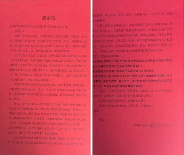 随后,他们还特意给湖南省中西医结合医院(湖南省中医药研究院附属医院)医务管理部寄来感谢信,信中写道:“在我们最无助的时候,是贵院的专家们星夜驰援、无私奉献,用大爱无疆的医者情怀,为我们带来了生的希望,感谢贵院培养出这么多优秀的医生!”