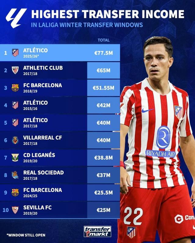 北京时间1月17日,德转列出了西甲冬窗出售球员的历史收入榜,今年冬窗连续出售加拉格尔(4000万欧元)、拉斯帕多里(2200万欧元)、哈维-加兰(50万欧元),再加上德保罗(1500万欧元)被迈阿密国际买断的马德里竞技以7750万欧元排名第一。