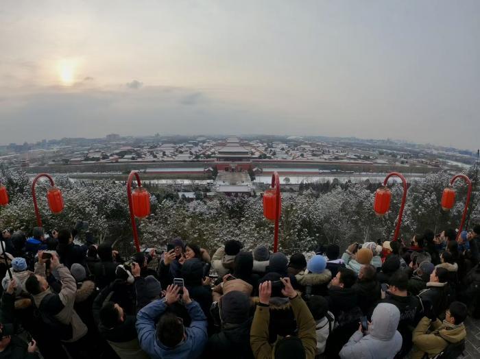 站在景山,故宫琉璃瓦被蓬松白雪覆盖,中轴线沿线建筑银装素裹,与远处的北海白塔相映成画。
