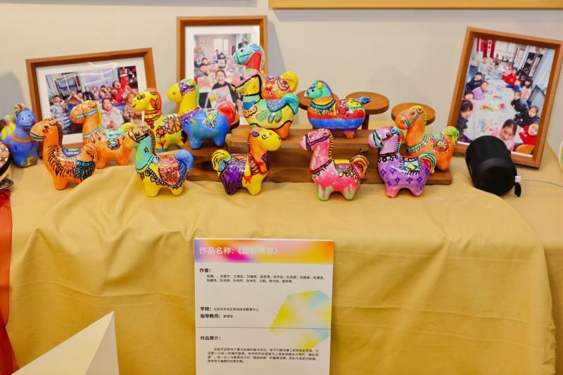 本次展览由北京市丰台区教育委员会主办,人民美术出版社和中央美术学院实验艺术与科技艺术学院进行学术指导。汇集北京市丰台区劳动技术教育中心、丰台区第五小学新发地分校、北京市第十八中学蒲芳学校、丰台区璞瑅学校、丰台区方庄小学、丰台区北宫小学、北京小学万年花城分校、北京晨光脑瘫儿童康复中心等近800件学生优秀作品。既有传承中华优秀传统文化的书画篆刻、匠心独具的非遗手作,也有紧跟时代潮流的现代数字艺术、探索前沿科技的VR绘画与互动科技装置,《千羽筑梦》中飞鸟翱翔、《木马逐风》科技感爆棚、VR幻影的《灵境大栅栏》《费纳奇境》的余晖效应和众多充满纯真、有趣的实验艺术作品,精彩纷呈。