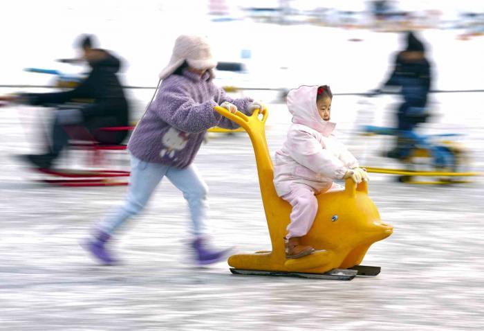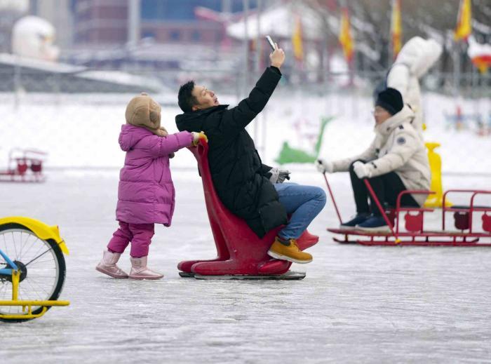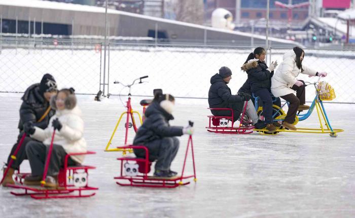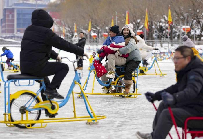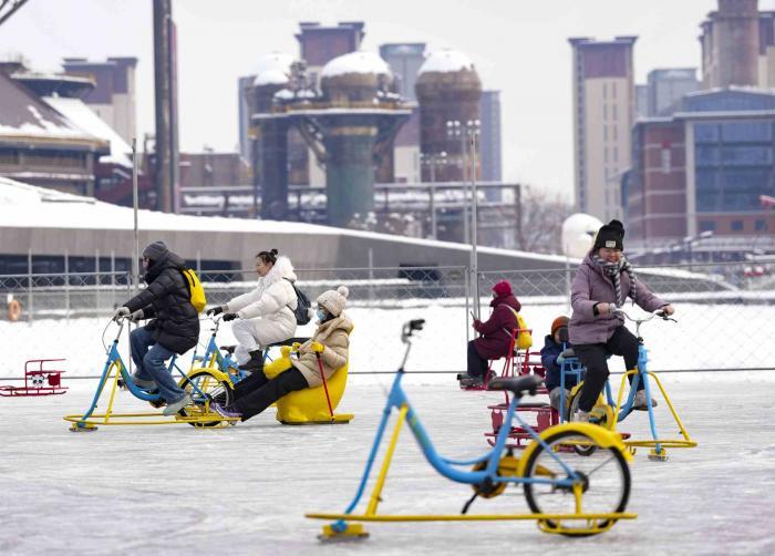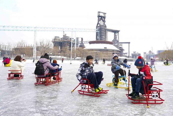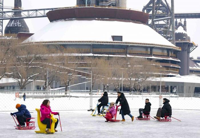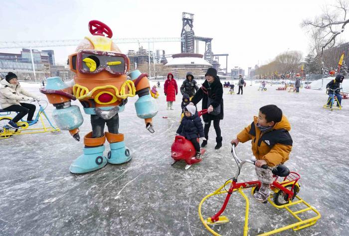 1月18日,游客们来到首钢园,体验第四届“秀冰场”。