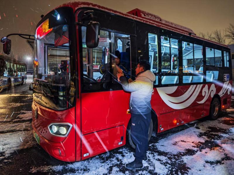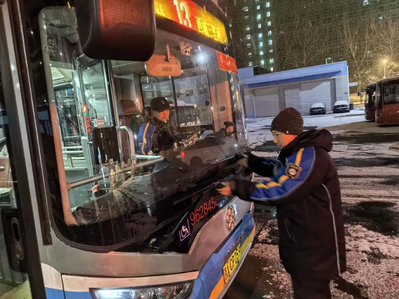强化现场安全,提升服务品质。降雪期间,公交集团针对3.2万人次驾驶员开展雪天行车安全专项叮嘱;在全市重点道路、桥区、公交站台等区域设置507处安全服务岗点,组织1000余人次管理人员及乘务巡检员现场值守,指挥引导车辆安全通行并提供站台便民服务,全力保障乘客平安出行。同时,所有运营车辆全面开启车厢暖风系统,为100余条重点线路的车厢铺设1.1万余个座椅小棉垫,并利用运营间隙及时清理车内积雪,为乘客营造温暖整洁的乘车环境。