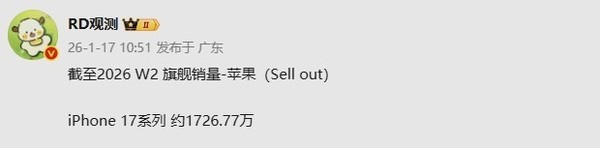 具体的销量数字进一步印证了其市场热度。根据数码博主“RD观测”披露的数据,截至2026年第二周,iPhone 17系列在国内的累计销量已达到约1726.77万台。这一成绩建立在持续增长的基础上,此前在2025年底,其累计销量已达1557.27万台。早前的销售数据也显示,该系列上市仅50天,在华销量便突破900万台,同比增长高达50%。