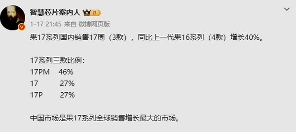 更值得关注的是产品内部的结构变化。销售数据显示,iPhone 17系列的三款机型呈现出明显的高端化趋势。其中,顶配机型iPhone 17 Pro Max成为绝对主力,占据了整个系列销量的46%,几乎拿下半壁江山。标准版iPhone 17与iPhone 17 Pro则各占27%的份额。