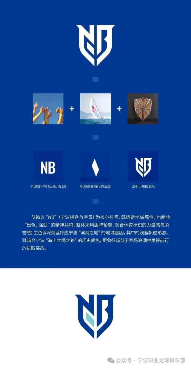 队徽以“NB”(宁波拼音首字母)为核心符号,既锚定地域属性,也暗含“出色、强劲”的精神共鸣;整体采用盾牌轮廓,契合体育标识的力量感与荣誉感;主色调深海蓝呼应宁波“滨海之城”的地域基因,其中的浅蓝帆船形态,既暗合宁波“海上丝绸之路”的历史底色,更象征球队于赛场浪潮中勇毅前行的进取姿态。