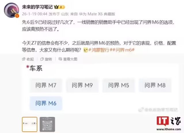 博主表示,今天还将有尚界 Z7 新车的信息曝出,后续就是问界 M6 的预热。在去年 12 月 9 日的鸿蒙智行年度直播中,华为常务董事、产品投资委员会主任、终端 BG 董事长余承东透露,2026 年鸿蒙智行五个界的产品矩阵会补齐,比如问界缺了 M6,还有问界车的迭代、尊界的超高端超豪华轿车推出。