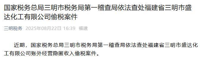 近日,国家税务总局三明市税务局第一稽查局公布一起重大偷税案件:福建省三明市盛达化工有限公司(以下简称“盛达化工”)通过个人银行账户隐匿收入、虚假纳税申报,最终被依法追缴税费、加收滞纳金并处罚款共计1005.92万元。