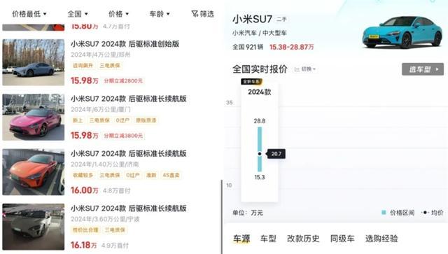 小米SU7新车上市初期,一车难求,在官方APP下定可能要等半年甚至一年的时间,因此有不少消费者加价求购,只希望能够早日开上新车。甚至在二手车市场,小米SU7的二手车价格也和新车没差别。不过随着小米汽车产能的提升,以及市场保有量的增多,尽管小米汽车的热度依然不低,但是终端价格逐渐回归理性,一些里程数超过2万公里的二手车,也展现出了一定的性价比。