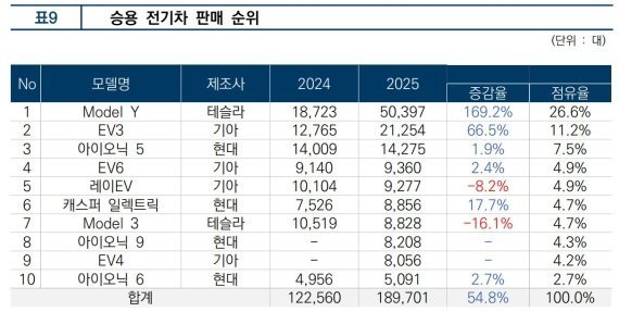 在车型销量排名方面,特斯拉Model Y表现尤为突出,以50397辆的销量位居榜首,且同比增长幅度高达169.2%;起亚EV3销量增长66.5%,达到21254辆;现代IONIQ 5销量增长1.9%,达到14275辆。