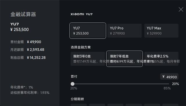 最新的消息是,小米汽车也推出了7年低息方案,似乎是瞄准了特斯拉,针锋相对。以指导价25.35万元的YU7为例,首付4.99万元,分期84个月,月供2593元,7年总利息大概1.4万元,年化费率约1%。从这里我们就能看出,特斯拉的7年“超低息”,的确是比小米汽车的7年“低息”更低的,特斯拉7年总利息还不到小米的一半。