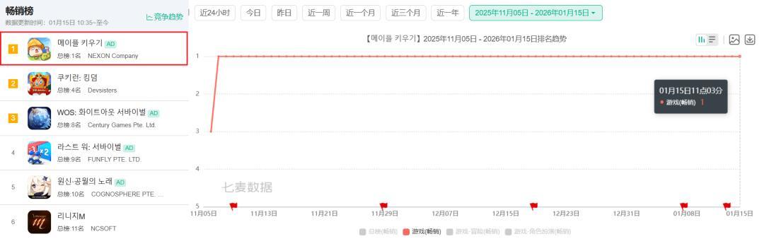上线70天了,《枫之谷:放置冒险记》还在韩服iOS畅销Top 1霸榜,压得一众本土巨头和国产出海大作抬不起头。