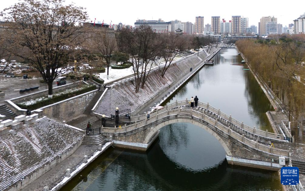 西安城墙东南角下的护城河(无人机照片,1月20日摄)。