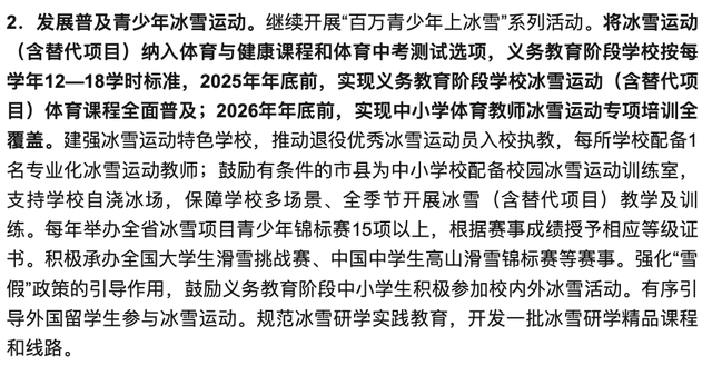 2024年12月,吉林省也发布通知,将冰雪运动(含替代项目)纳入体育与健康课程和体育中考测试选项,义务教育阶段学校按每学年12—18学时标准,2025年年底前,实现义务教育阶段学校冰雪运动(含替代项目)体育课程全面普及;2026年年底前,实现中小学体育教师冰雪运动专项培训全覆盖。