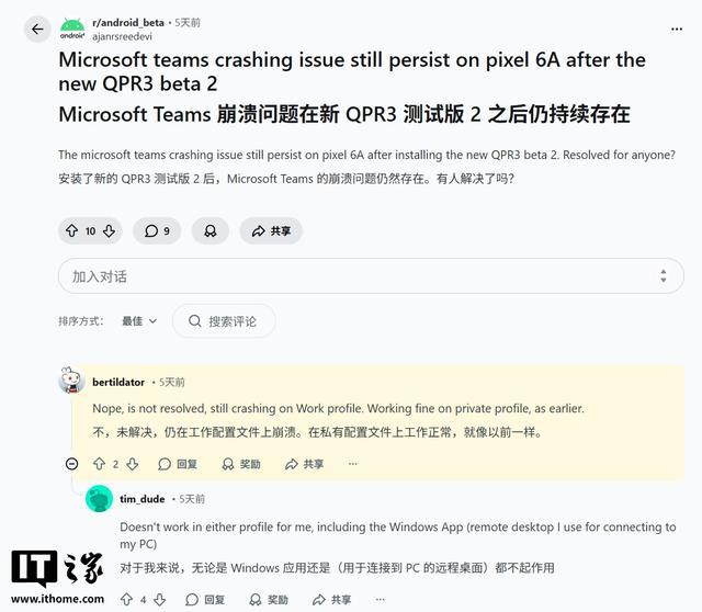 部分用户在 Reddit 论坛 Android Beta 板块以及谷歌官方 Issue Tracker 中指出,这些 Bug 仍然存在,不过不同人群遇到的问题各不相同:有些人只是 Microsoft Teams 会突然崩溃,而有的人则是多款微软 App 同时受影响,还有用户表示 Microsoft Launcher 也存在异常。