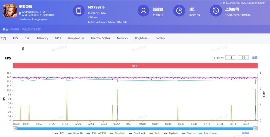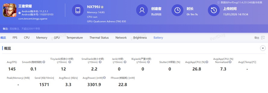 《王者荣耀》是红魔11AIR原生支持144Hz高刷的游戏,除了这款游戏现在已有《英雄联盟手游》《穿越火线-枪战王者》《暗区突围》《火影忍者》《QQ 飞车手游》《和平精英》《跑跑卡丁车》实现原生144Hz 适配,未来还有《三角洲行动》《使命召唤手游》《金铲铲之战》《无畏契约手游》多款游戏适合144Hz高刷。在测试使用画质拉满,开启高刷模式,进行了一局约9分钟的对战,实测红魔11AIR平均帧率为145FPS,1%低帧率为135.2FPS,平均功耗为3301.9mW,FPS几乎成了一条直线。