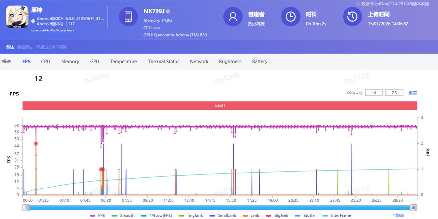 在手游测试中,我们选择了依然火爆的《原神》以及《王者荣耀》。其中《原神》会进行连续30分钟的测试,画质拉满,设置为60FPS高帧率模式,用性能狗记录手机的实际帧率,实测平均帧率为60.9FPS,1%低帧率为50.7FPS,平均功耗为3356.9mW,可见红魔11AIR在遇到复杂画面时帧率会有所下降,但并不严重。