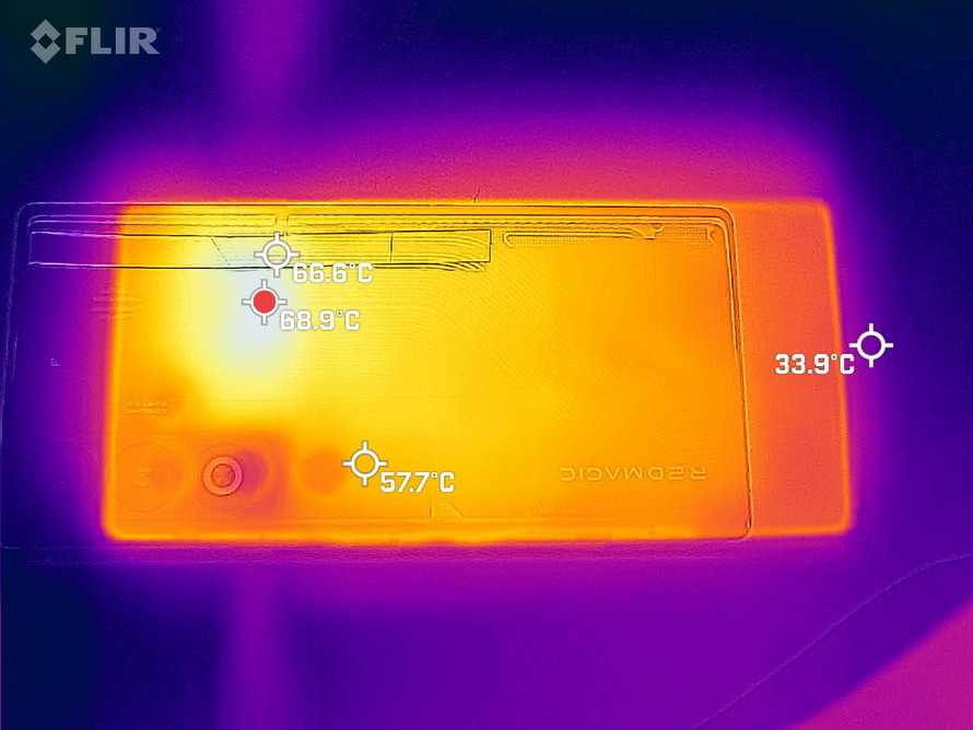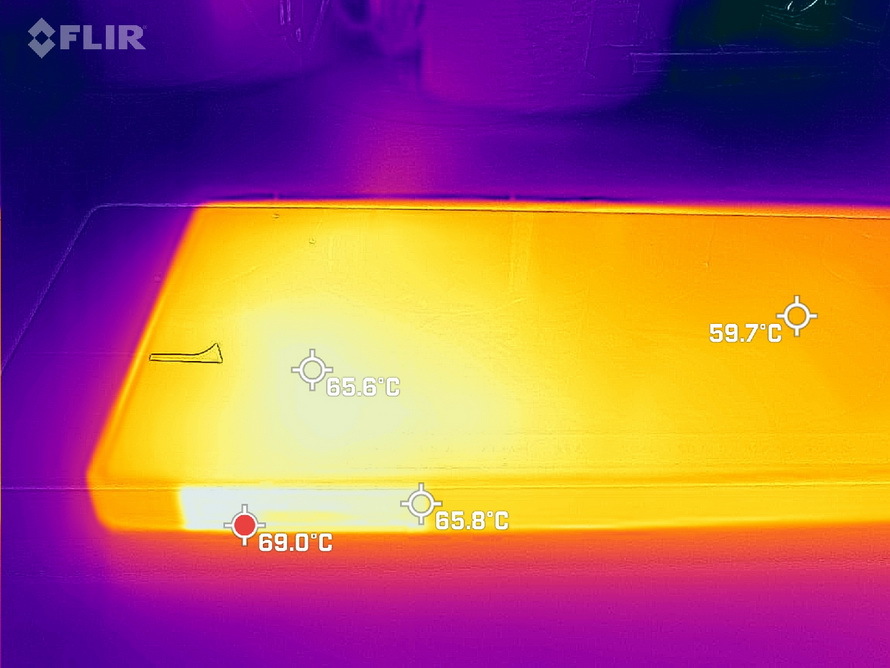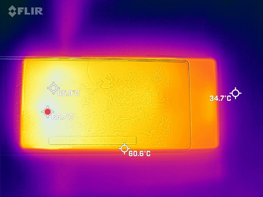 在Wild Life Stress Test测试即将结束之时,测量了机身表面温度,结果机身正面、背面、出风口温度都超过65℃,证明风扇不是摆设,而是努力工作的。