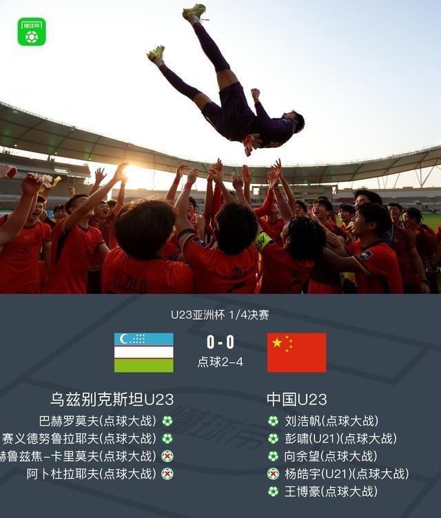 1/4决赛,赛前中国U23显然是不被看好的一方,比赛开始后场上的形势也印证了这一点,乌兹别克斯坦U23狂轰滥炸,几次几乎就要攻破U23国足的大门,但李昊仿佛在本届比赛被所有门将大神附体,全场面对8次射正全部化解,将比赛拖入点球大战。点球大战中虽然杨皓宇罚失点球,但无伤大雅,对手一球击中横梁,李昊扑出了对手第四个点球,中国U23点球战胜乌兹继续昂首挺进半决赛。