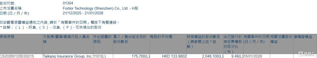 格隆汇1月21日丨根据联交所最新权益披露资料显示,2026年1月16日,FORTIOR(01304.HK)获Taikang Insurance Group, Inc.在场内以每股均价133.9802港元增持17.57万股,涉资约2354.03万港元。