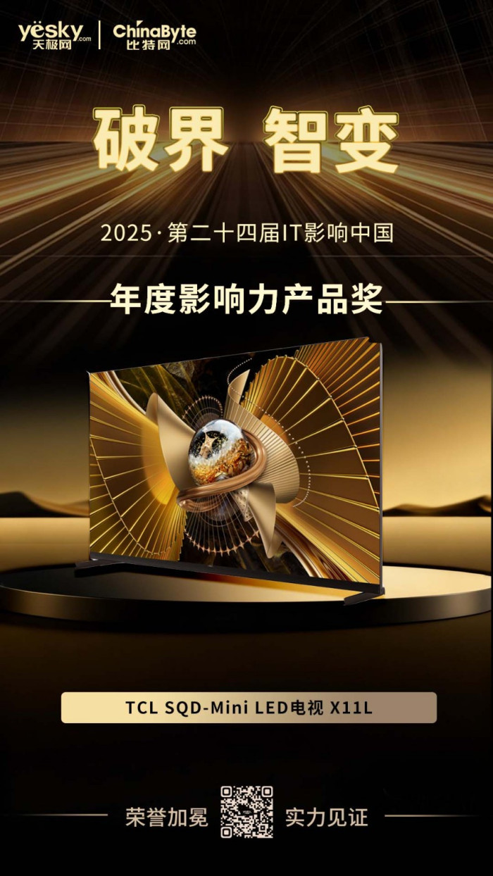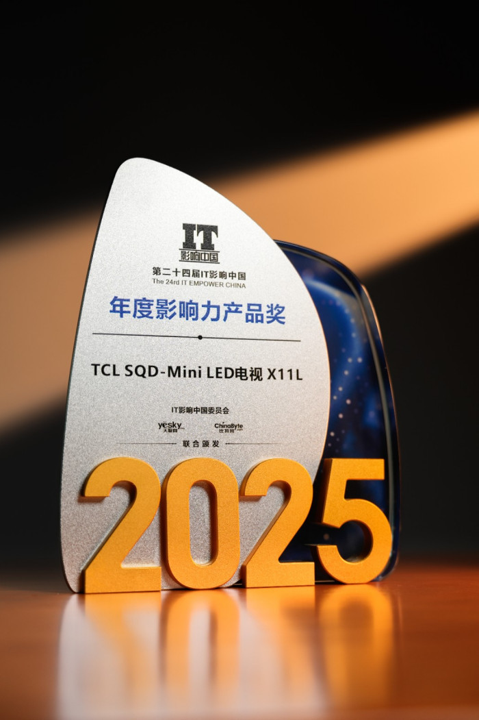 自2002年创办以来,「IT影响中国」奖项始终关注中国IT科技消费热点与科技行业年度风云变化,深入挖掘行业创新价值、倾听消费者心声、聚合业内优质资源与业界精英,评选表彰那些表现突出、引领潮流的科技产品、企业及先锋人物,旨在挖掘科技创新优势,展示行业在数智化变革中所取得的成就,见证科技进步力量。日前,2025年第二十四届IT影响中国奖项正式公布,TCL X11L电视是2025年的年度“机皇”,集合了TCL最新锐的技术,100%BT.2020全局高色域、20736个万象分区、DR 10000nits峰值亮度以及2cm的超薄尺寸不仅是行业最顶级的存在,也是2025年的行业标杆,荣获“年度影响力产品奖”