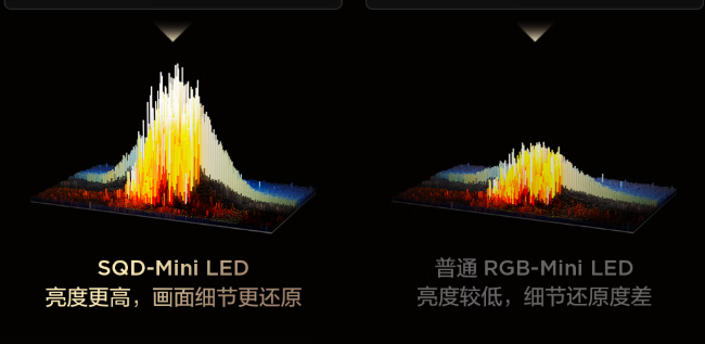 SQD-Mini LED技术的核心突破在于色彩,它基于“超级量子点”材料与“超级蝶翼华曜屏”的协同,实现了稳定的100% BT.2020全局高色域。SQD-Mini LED的卓越不止于色彩,在光的控制与强度上同样实现了碾压性领先。由于一颗SQD发光芯片即可产生白光,其效率等同于RGB-Mini LED的三颗芯片。其单灯发光效率更高,使X11L系列达到了惊人的绚彩XDR 10000nits峰值亮度。这不仅带来了无与伦比的视觉冲击力,还能确保高亮画面不泛白、暗场细节不丢失,在任何光照环境下都能呈现最具沉浸感的画面。