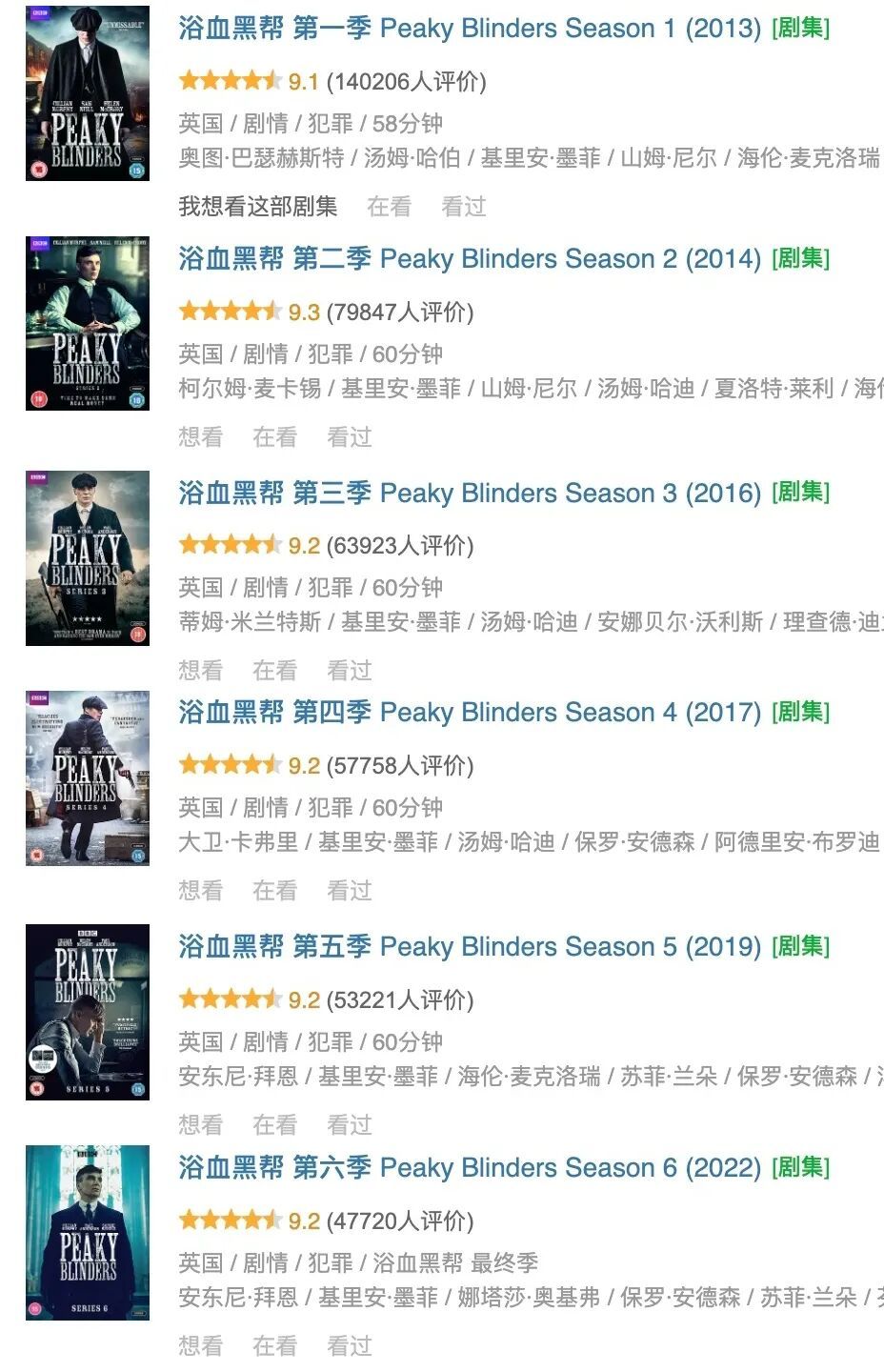 因为目前仍在播的英剧《浴血黑帮》堪称英伦黑帮史诗,季季9分+。目前完播六季,最高9.3,最低9.1!