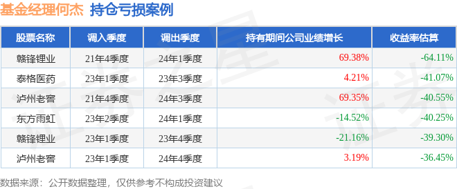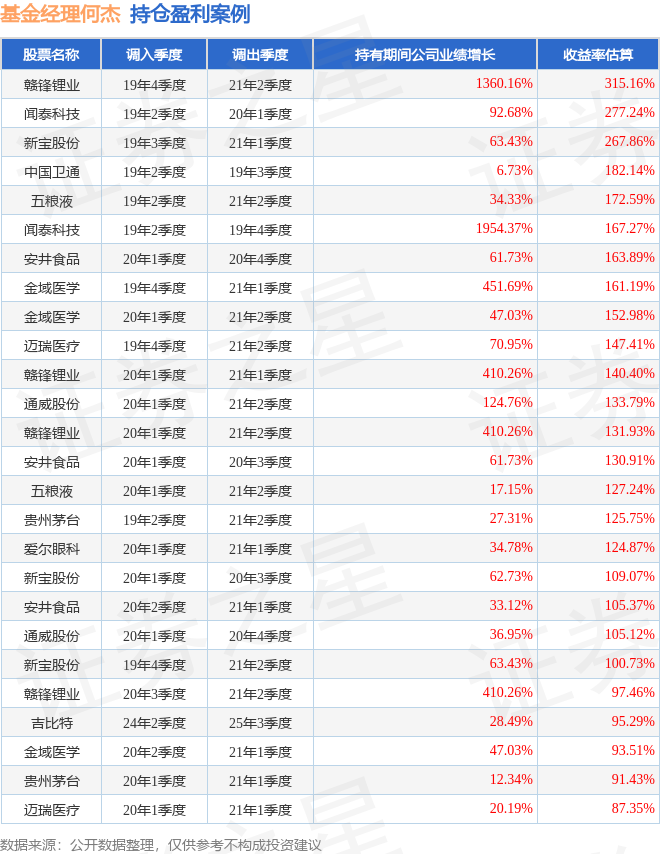 何杰管理的前海联合泓鑫混合A基金在19年4季度买入赣锋锂业,在持有1年又2个季度后在21年2季度卖出。持有期间的估算收益率为315.16%,持有期间赣锋锂业在2019年到2021年的年报归属净利润增幅达1360.16%。