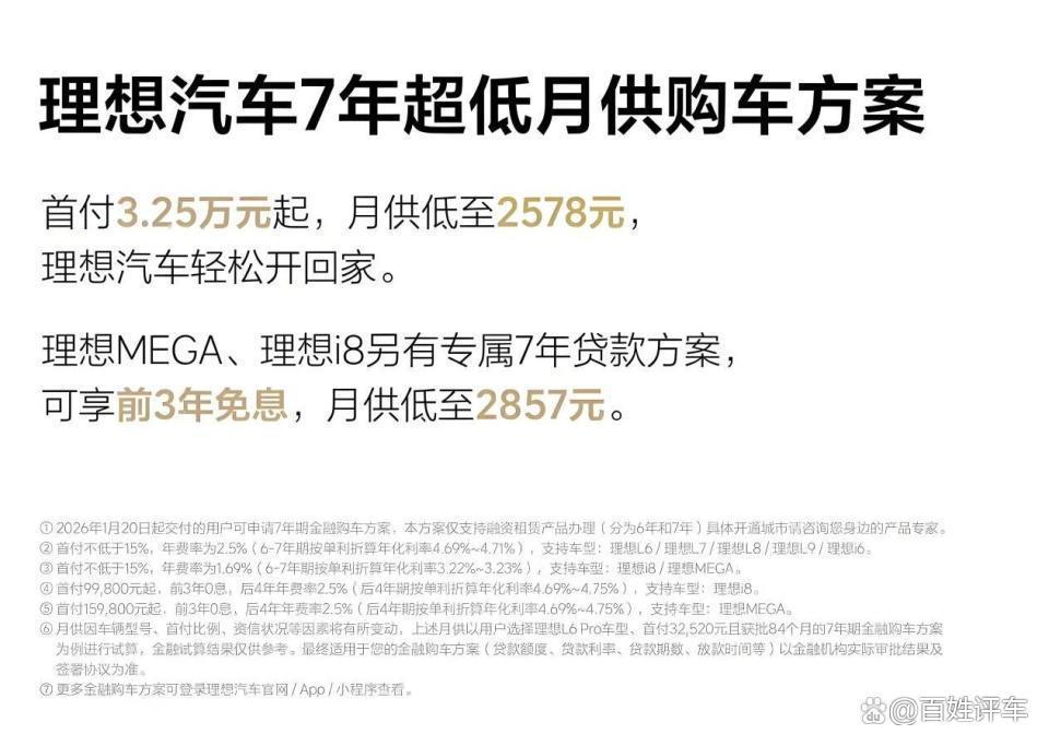 这是继特斯拉和小米之后,第三家在中国推7年分期的新势力。特斯拉1月6日率先出手,给Model 3和Model Y上了7年低息贷;小米1月15日跟进,为YU7也搞了类似政策。理想这次动作很快,明显不想掉队。