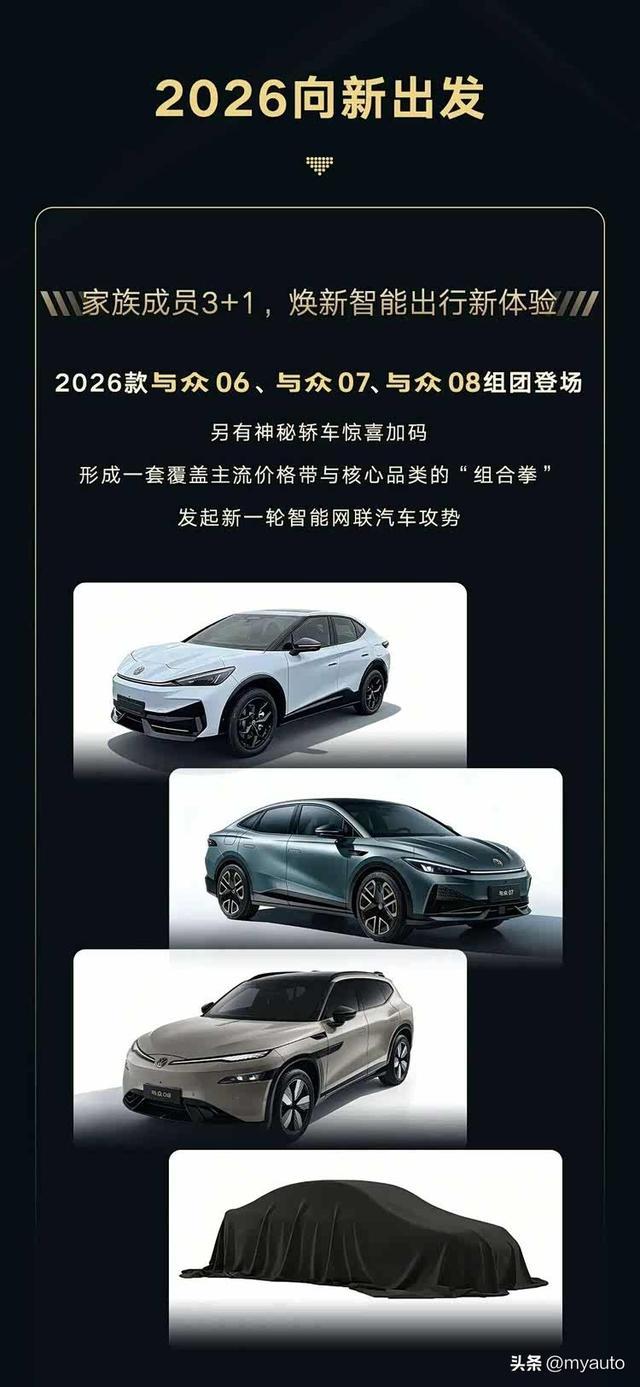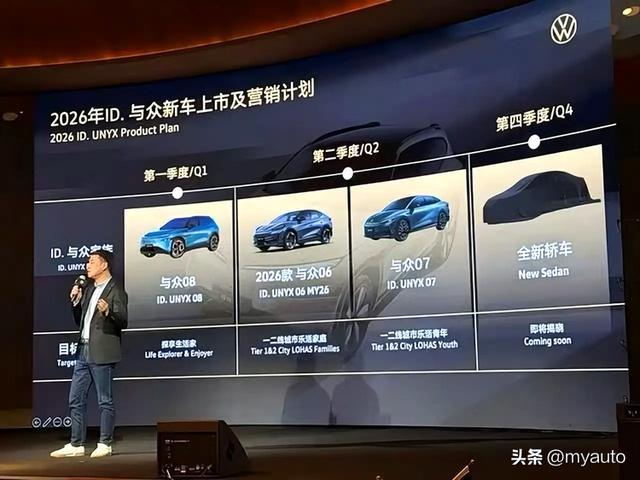 2025年略显沉寂的大众安徽,将在2026年迎来爆发式的“逆袭”。根据最新规划,今年一季度,大众安徽将率先推出其首款中型智能电动SUV——与众08。紧接着在第二季度,2026款与众06和全新车型与众07也将相继上市,而第四季度还会压轴亮相一款全新轿车。一口气推出四款新车,大众安徽这“后劲”确实有点猛。