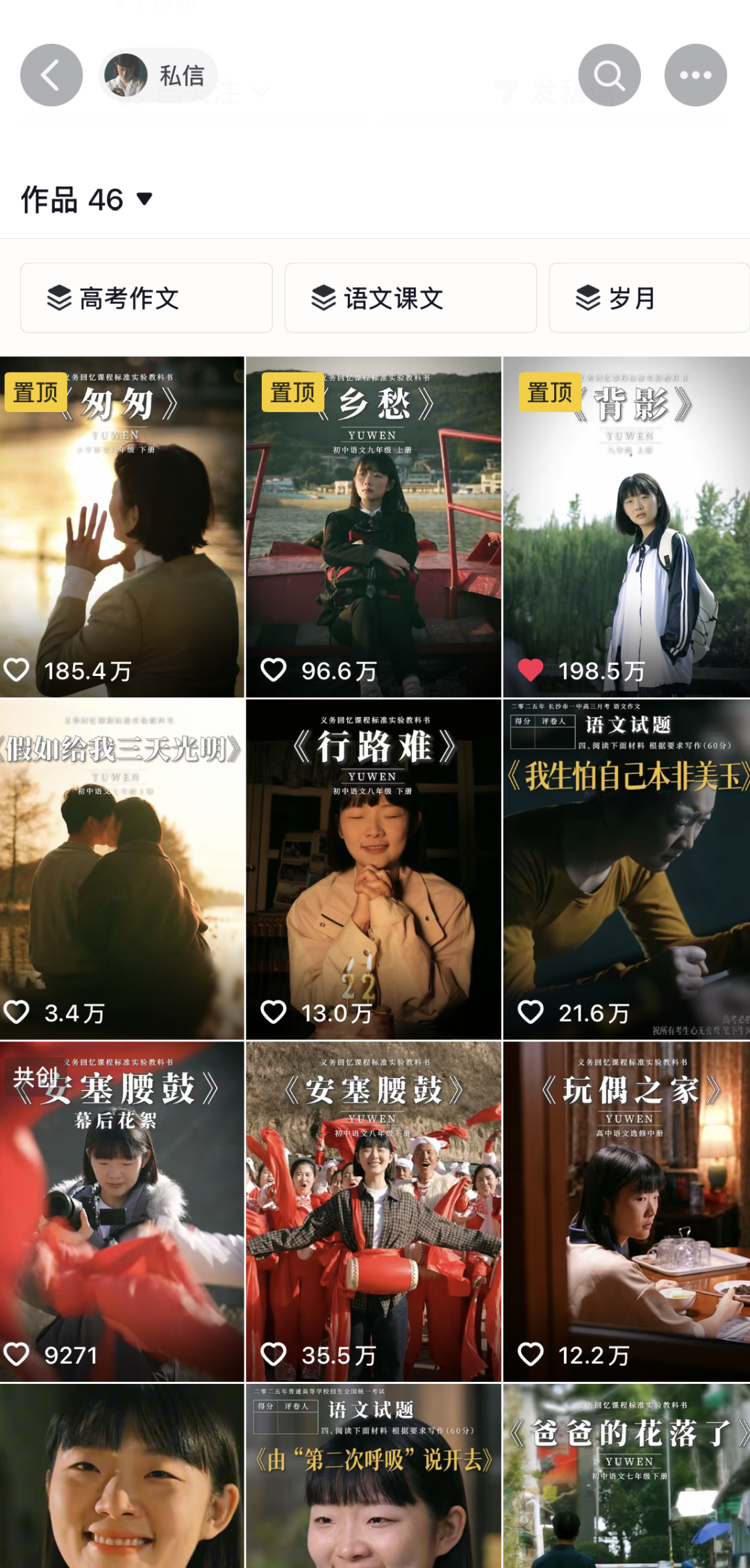 点开她的主页,你会发现她几乎没有“试错期”。从第一条视频开始,就锚定一个别人没碰过的切口:语文课文。