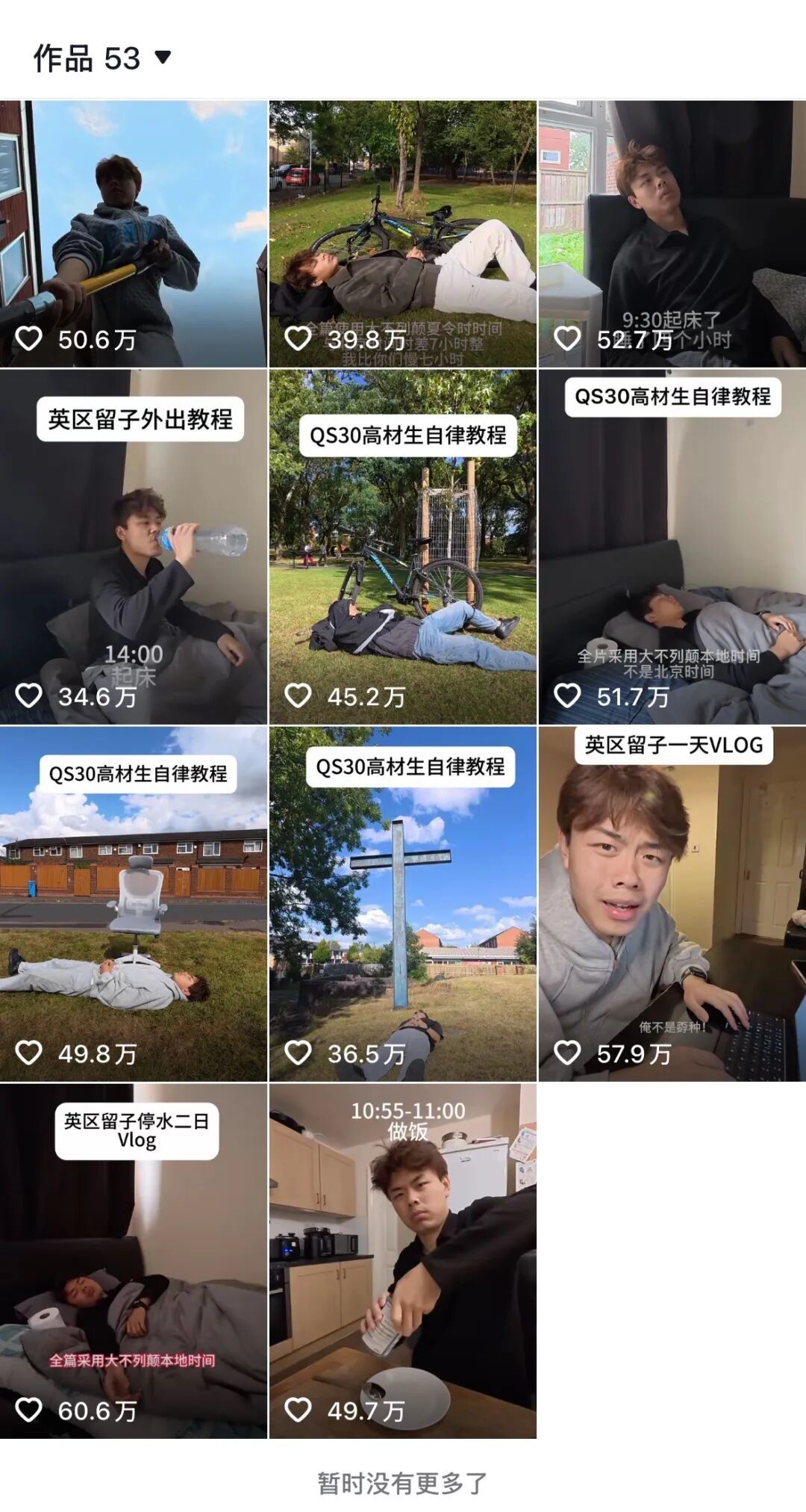 @白日梦想家 2025年8月发布了首条30万在英国留学的vlog,充满死感的剪辑和画面,让他从第一期开始视频数据就很好,还让网友锐评:“第一期《魔童降世》”“豆豆子第一个视频就这么会拍会剪吗?”