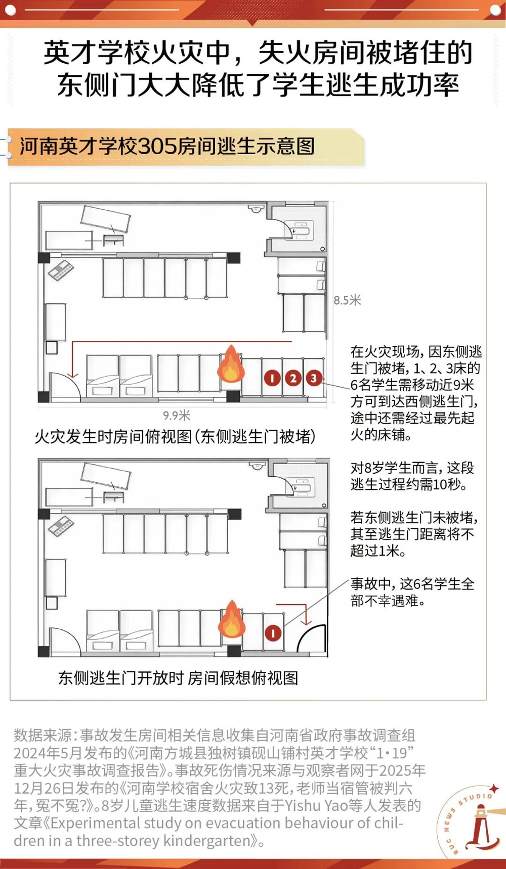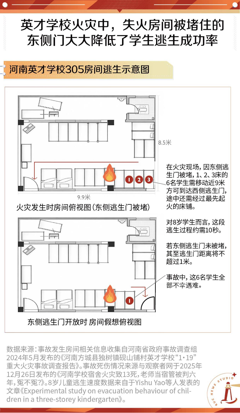 事发宿舍人员高度密集,33名学生的实际居住人数明显超过河南省关于义务教育学校办学条件的相关标准要求。更严重的是,宿舍原本设置东西两扇疏散门,但东侧疏散门被床铺堵挡,无法正常通行。多重风险叠加,最终酿成悲剧。