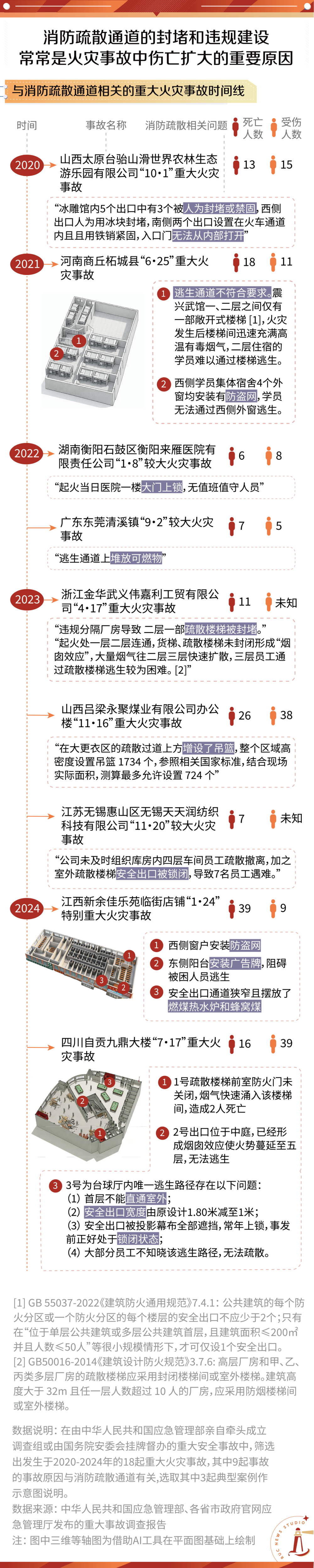 国家安全生产应急救援中心一级巡视员雷长群在节目中指出,疏散通道堵塞是造成人员伤亡扩大的重要原因之一。同时,国家消防救援局消防监督司三级指挥长舒畅也直言,在一些场所虽然设置了疏散设施,但由于设计、设置不合规或维护不到位,往往形同虚设,一旦发生火灾,将严重影响人员逃生和灭火救援[5]。