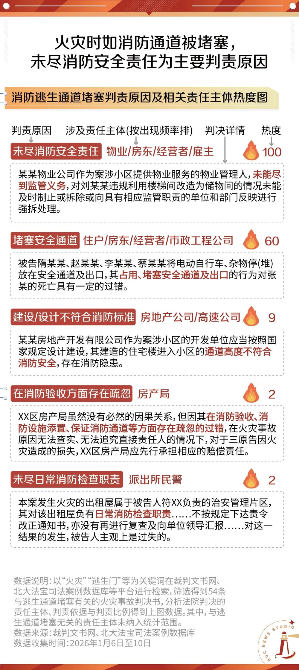 发生火灾时,疏散通道被堵塞,相关主体很可能被追究法律责任。我们在北大法宝、裁判文书网上筛选出54篇与逃生通道堵塞相关的火灾的判决书,发现未尽消防安全责任为主要判责原因,该原因涉及最多的责任主体是物业。其中,物业被判责大多是因为在其他人员堵塞通道后未能采取有效措施进行整改。