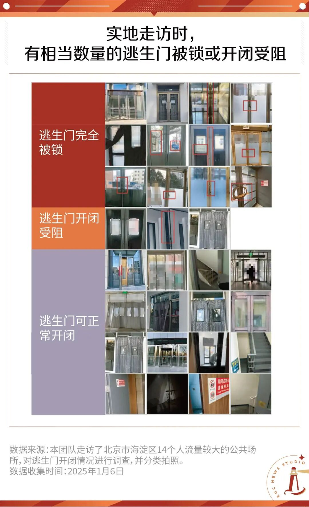 结果显示:约20%的规划安全出口未正常开放;超过一半的场所存在至少一个安全出口未正常开放的问题。其中问题最严重的一处场所,规划设置4个安全出口,但实际仅开放1个出口。