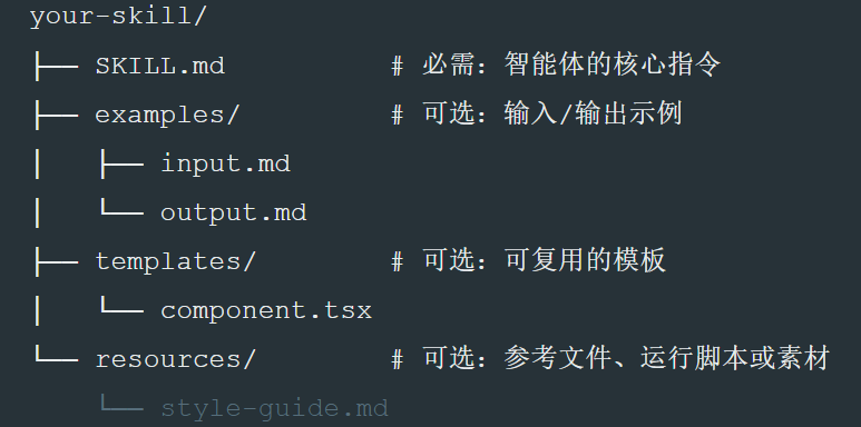 可以看到,一个 Skill 的典型结构是这样的,其中仅有 SKILL.md 文件是必需的,其它都是可选的,具体会根据你的 Skill 需要来决定: