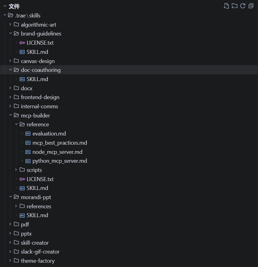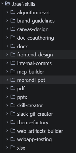 具体来说,要在 TRAE 中使用一个 Skill,只需将其文件夹放到项目文件夹的 .trae/skills 目录下即可。
